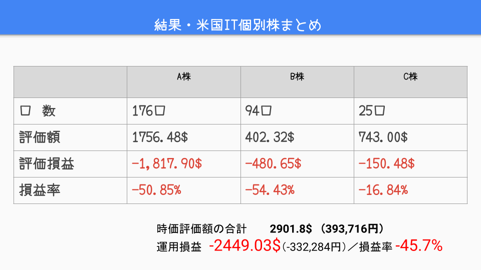 さすがに名前は伏せさせていただきますが、米国のベンチャーIT企業個別株3件の投資結果で、個別株がどういうものか経験するためにはじめた3件です。